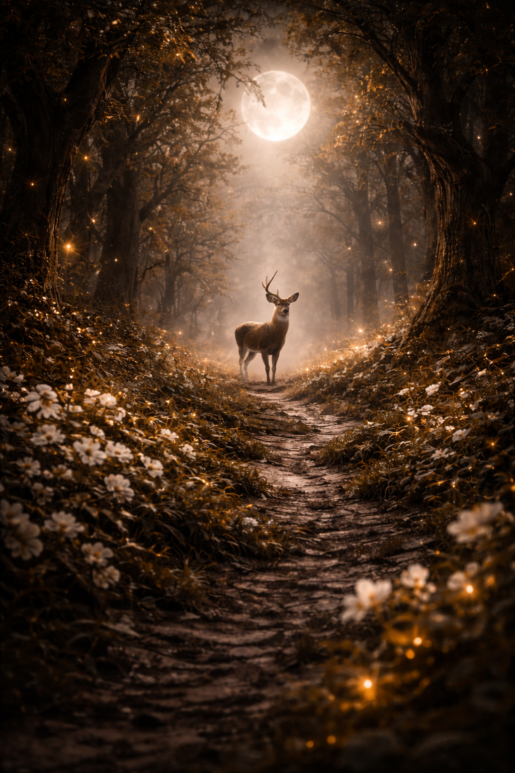 Hunters who sought it never succeeded, for the deer was said to appear only when it chose to, stepping into moonlight like a vision. Villagers whispered that it could not be caught because it was not meant to be owned — it was meant to be remembered. Some believed the deer carried with it the spirit of the forest itself, and that to see it, even once, was a blessing of fortune and strength. Its path was fleeting, yet wherever it passed, the air seemed to hold a fragrance of amber woods and wild blossoms — as if the forest itself wished to linger in its wake.